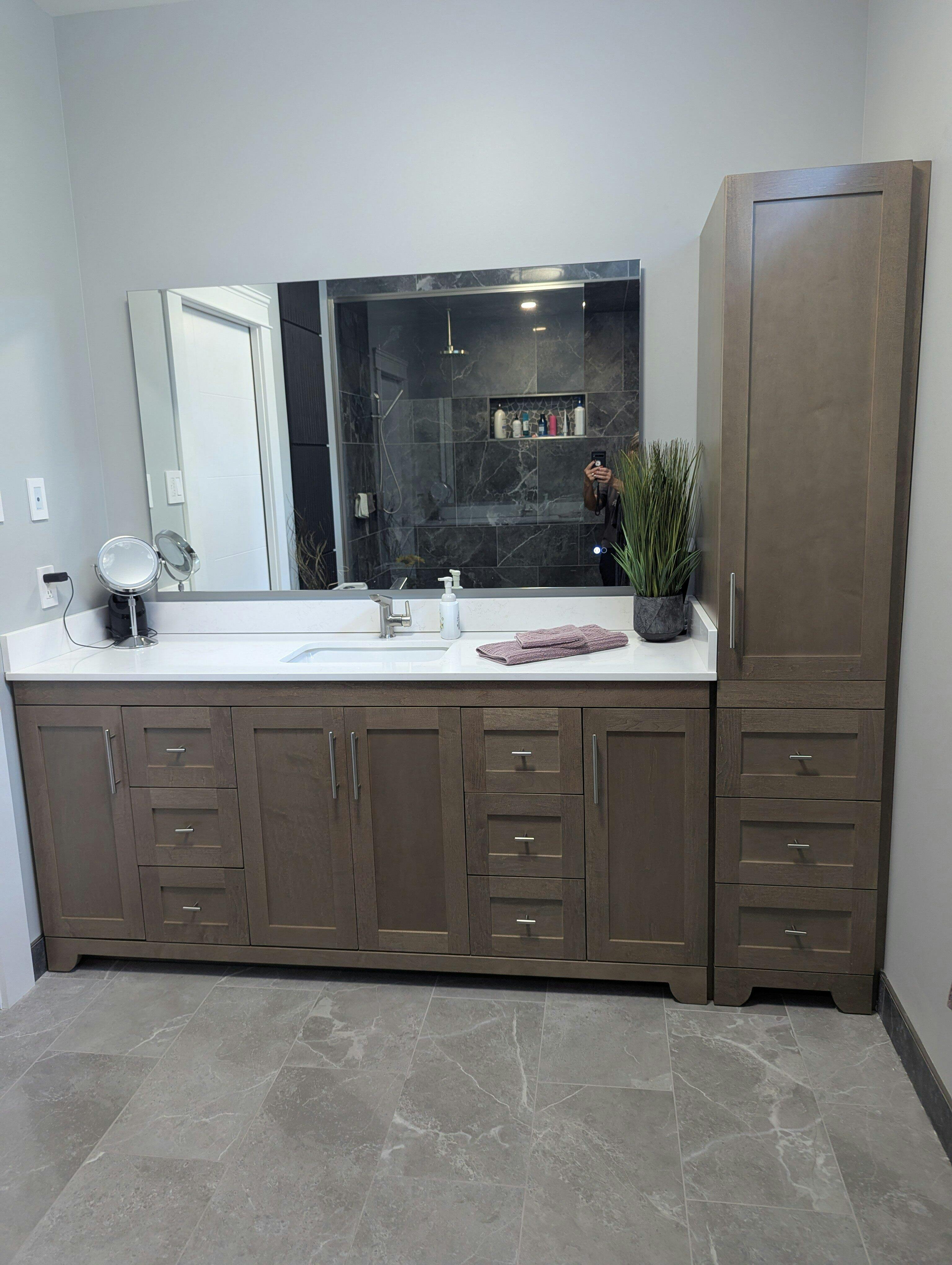 Complete your bathroom with a Westmount Linen Tower, crafted from solid wood and proudly made in Canada. Designed to match the elegance of the Westmount vanities, these towers provide ample storage with adjustable shelves and soft-close doors. available in a stunning natural maple stain, olive stain, white, grey, or black finish—each showcasing the beauty of the Westmount. As this vanity is made from solid wood, the stain can differ in colour by 5% darker or lighter. The side panels and fronts become MDF when you select a painted option. Available in 19 or 22 inch depth.